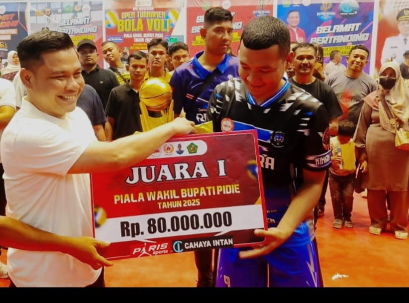 SIGLI – Tim voli Maura Sumut keluar sebagai juara 1 di Open Turnamen Bola Voli Piala wakil Bupati Pidie dalam rangka memperingati Hari Damai Aceh ke-20 tahun setelah mengalahkan Bima Cakti Bank Indonesia dengan Skor 3-1 Di Gor PCC Sigli, Senin 25 Agustus 2025 malam.