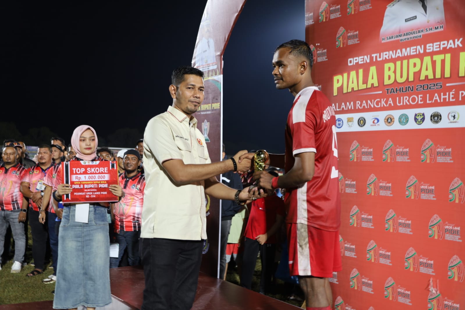 SIGLI – Open Turnamen Piala Bupati Pidie tahun 2025 resmi berakhir setelah Tim Mutiara Raya keluar sebagai Juara setelah mengalahkan tim CST United Pidie Jaya dengan skor tipis 2-1 di lapangan stadion Blang Paseh Kota Sigli, Senin 13 Oktober 2025 malam.
