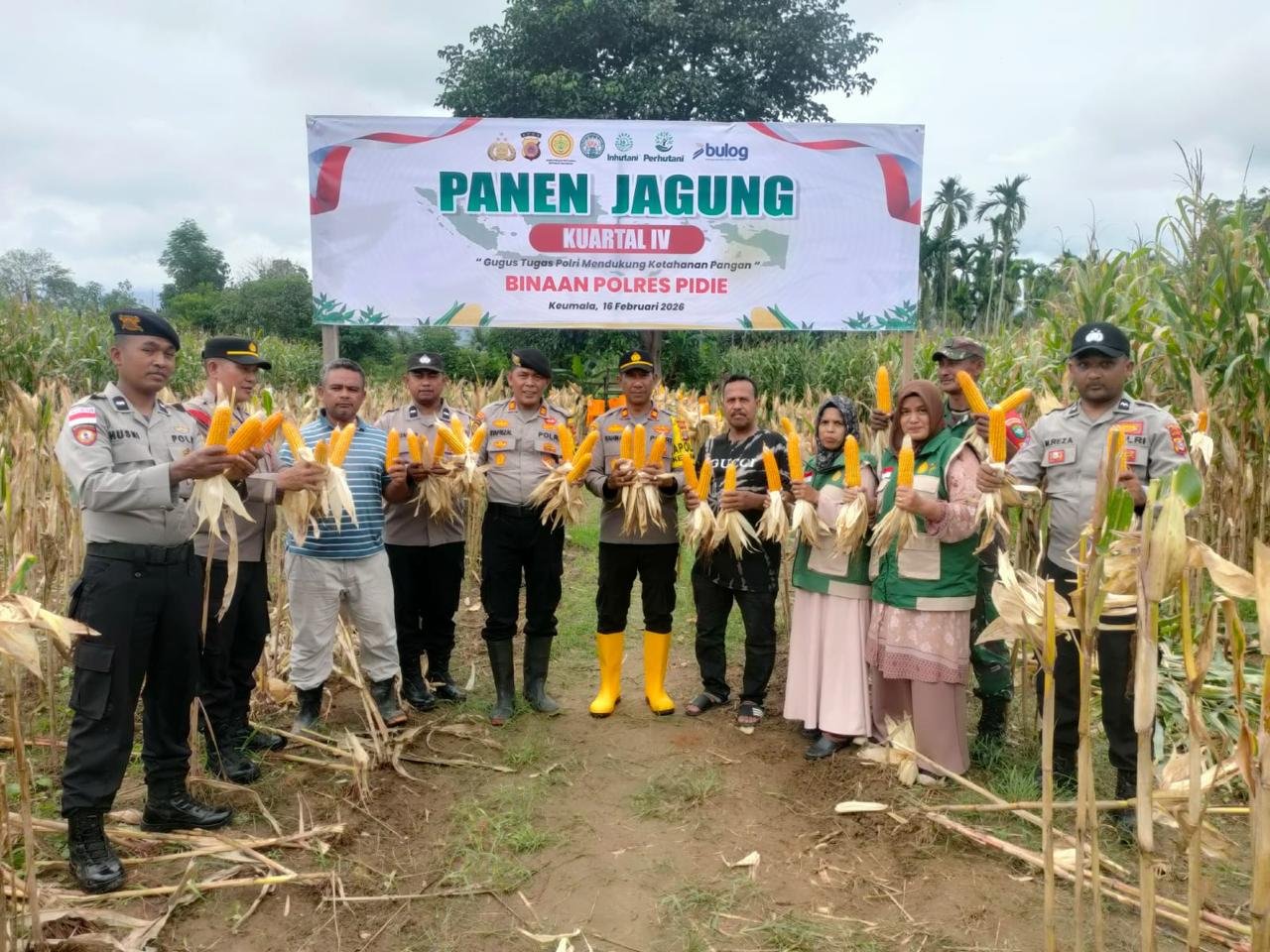 Sigli – Dalam rangka mendukung program Swasembada Pangan Nasional Tahun 2026, Polres Pidie melaksanakan kegiatan Panen Jagung Kuartal IV Tahun 2025 di lahan milik masyarakat binaan yang berada di Gampong Jijiem, Kecamatan Keumala, Kabupaten Pidie, Senin (16/2/2026)