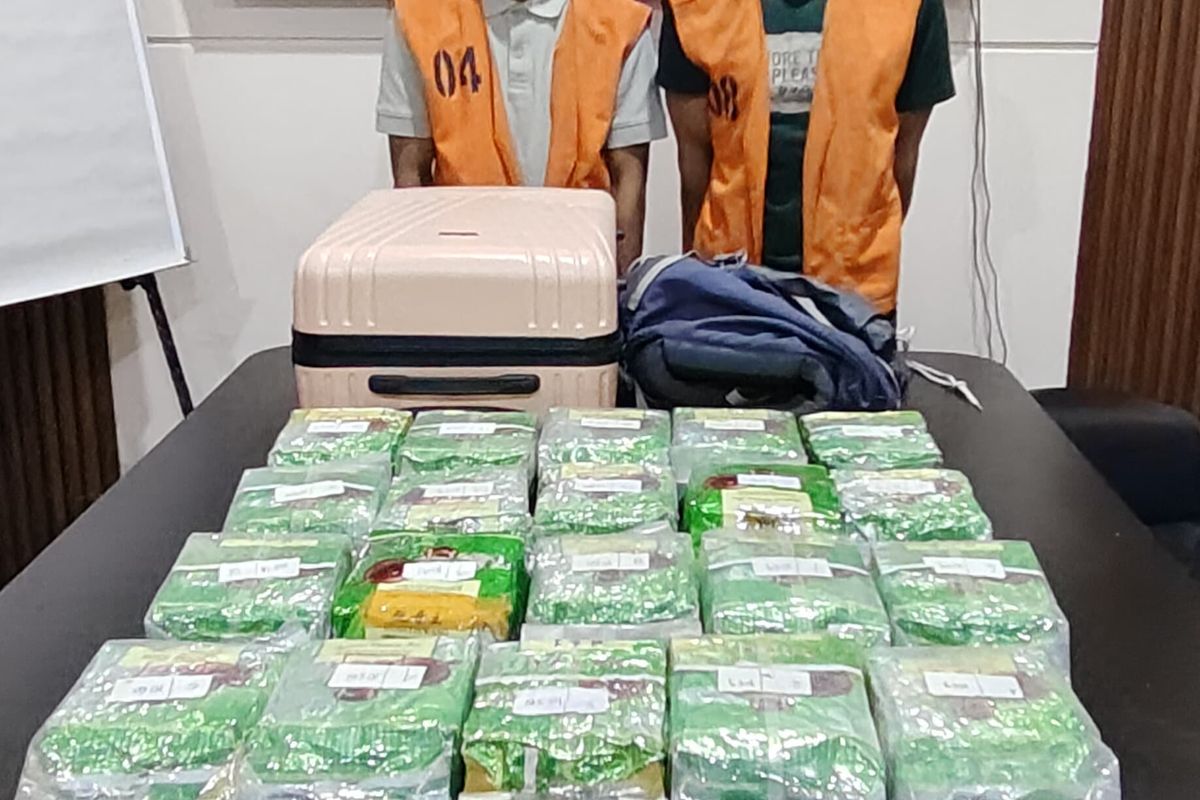 “Dari dalam tas gunung berwarna biru dan koper pakaian berwarna pink, petugas menemukan 20 bungkus plastik teh cina warna hijau berisi sabu dengan berat total bruto kurang lebih 21.142 gram atau 21 kg lebih,” ungkap Hendria.