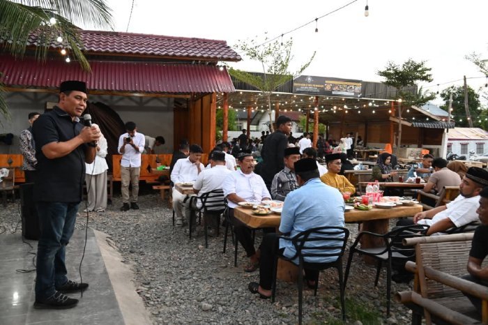 Bupati Aceh Besar, H Muharram Idris menyampaikan tausyiah jelang berbuka puasa bersama Pengurus Kwarcab Pramuka Aceh Besar, di SMEA Premium Kopi Ulee Lheue, Banda Aceh, Kamis (12/02026) sore. FOTO/MC ACEH BESAR