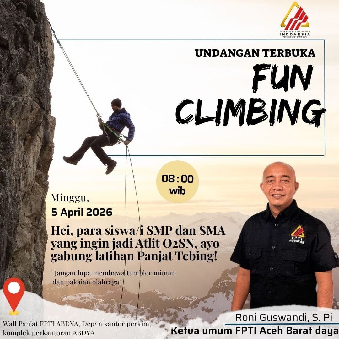 BLANGPIDIE – Federasi Panjat Tebing Indonesia (FPTI) Kabupaten Aceh Barat Daya akan mengadakan kegiatan “Fun Climbing” pada Minggu, 5 April 2026, pukul 08:00 Wib.
