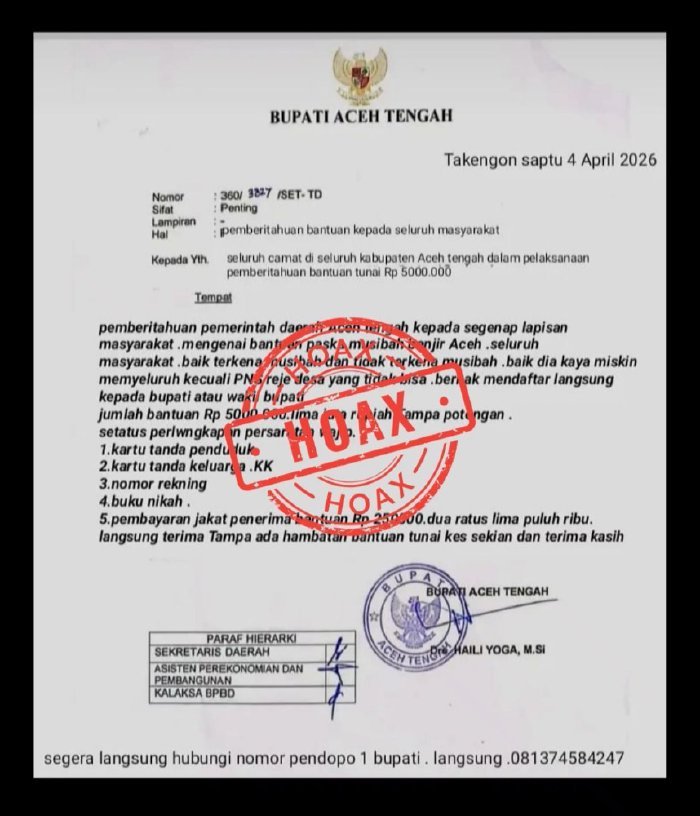 Takengon – Pemerintah Kabupaten Aceh Tengah memastikan bahwa surat yang beredar di masyarakat sabtu (4/4/2026) terkait bantuan pasca banjir dan mengatasnamakan Bupati Aceh Tengah adalah tidak benar (hoaks).