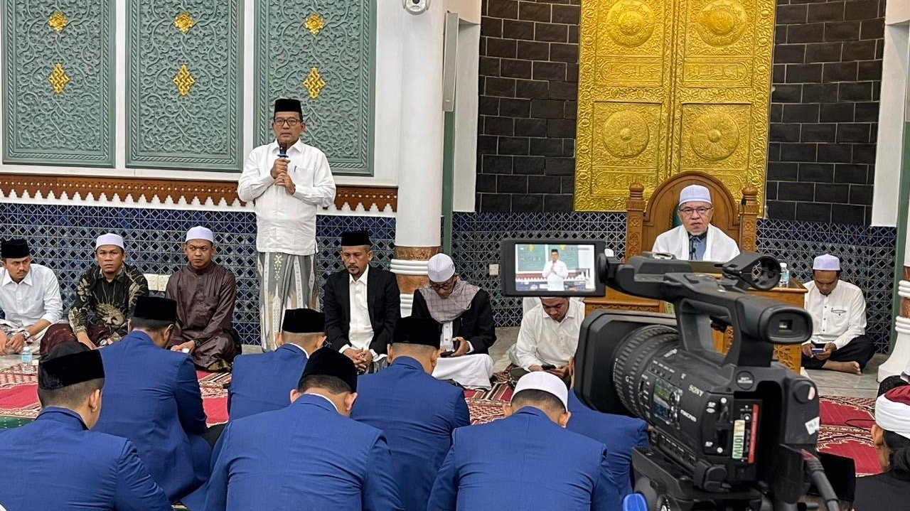 BANDA ACEH – Kepala Kanwil Kementerian Agama Provinsi Aceh Drs H Azhari MSi sampaikan sambutan pengajian Tasawuf, Tauhid, dan Fikih (Tastafi) di Masjid Raya Baiturrahman, Jumat malam, 10 April 2026.