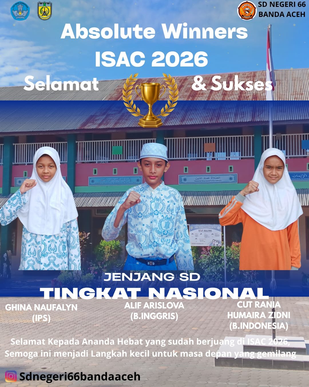 “Alhamdulillah kita berhasil meraih Absolute Winners Diajang ISAC 2026 ini merupakan prestasi yang menggembirakan bagi guru dan murid SDN 66 Banda Aceh,” ungkap Nurrahmi, S.Pd.,Gr.