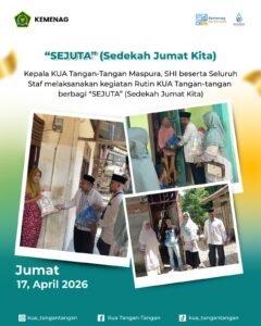 Tangan-Tangan, 17 April 2026 — Kantor Urusan Agama (KUA) Kecamatan Tangan-Tangan kembali melaksanakan program rutin berbagi bertajuk “SEJUTA” (Sedekah Jumat Kita) pada Jumat (17/4/2026). Program ini kini telah memasuki tahun kedua pelaksanaan, sebagai bentuk konsistensi KUA dalam menumbuhkan nilai kepedulian sosial dan semangat berbagi kepada masyarakat yang membutuhkan.