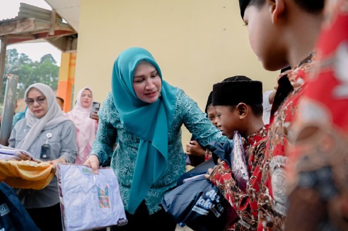 “Semangat belajar ya nak ya. Jadilah murid yang baik serta taat dan patuh pada guru-guru kalian ya,” kata perempuan yang akrab disapa Kak Na itu, didampingi Ny. Bd. Erni Handayani T. Zainal, S. Keb.