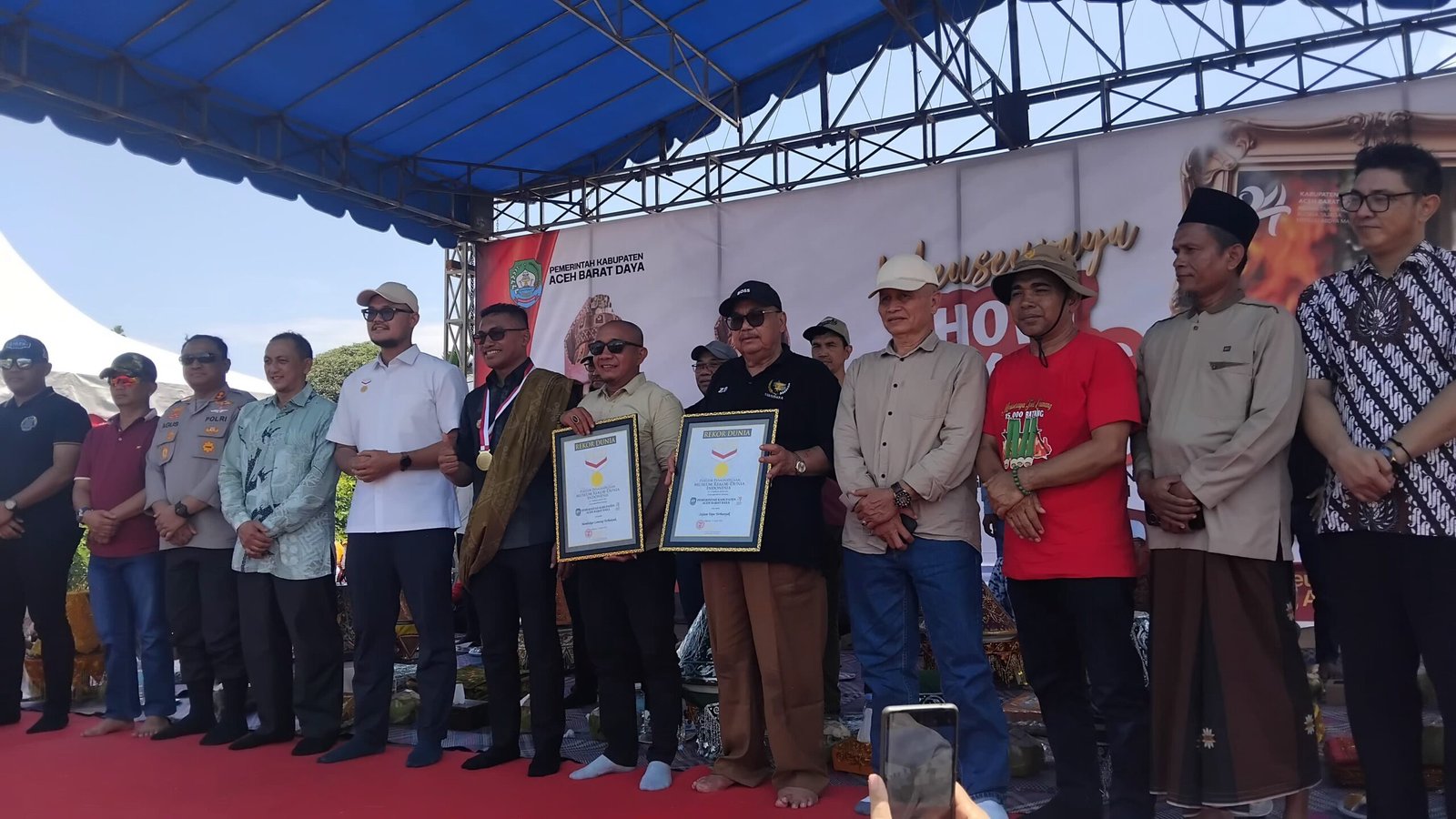 Piagam penghargaan diserahkan langsung oleh Lutvi Syah Pradana – Customer Relation Manager MURI kepada Bupati Abdya Dr. Safaruddin, S. Sos MSP yang disaksikan oleh Bryan Razu Ramadhan – Customer Relation dan puluhan ribuan masyarakat yang memadati lokasi acara.
